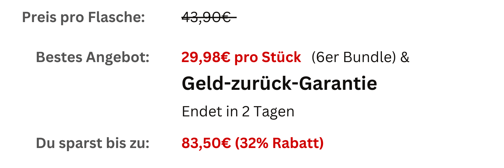 Achtung! Dies ist ein exklusives Neukundenangebot, das nur für wenige Tage gilt. Sobald die verhandelte Stückzahl vergriffen ist, endet der Deal. Sichere dir also heute noch das Angebot und teste das Produkt für volle 30 Tage risikofrei zuhause.